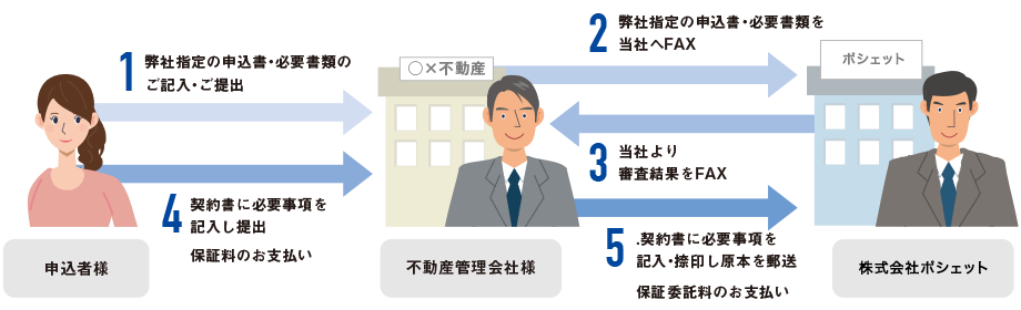 - 契約書に必要事項を記入し弊社業務提携先の不動産管理会社様に提出するとともに、保証料をお支払いください。